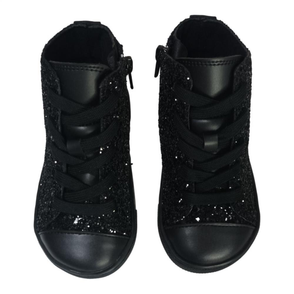 Los botines barefoot Electra Negro de Coqueflex combinan estilo y respeto por el desarrollo natural del pie. Veganos, flexibles y con un toque glitter irresistible.