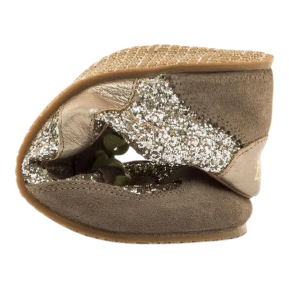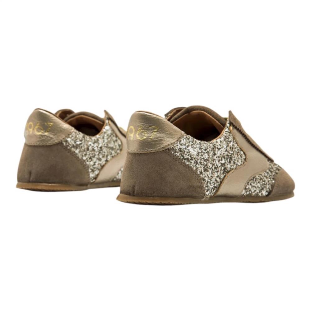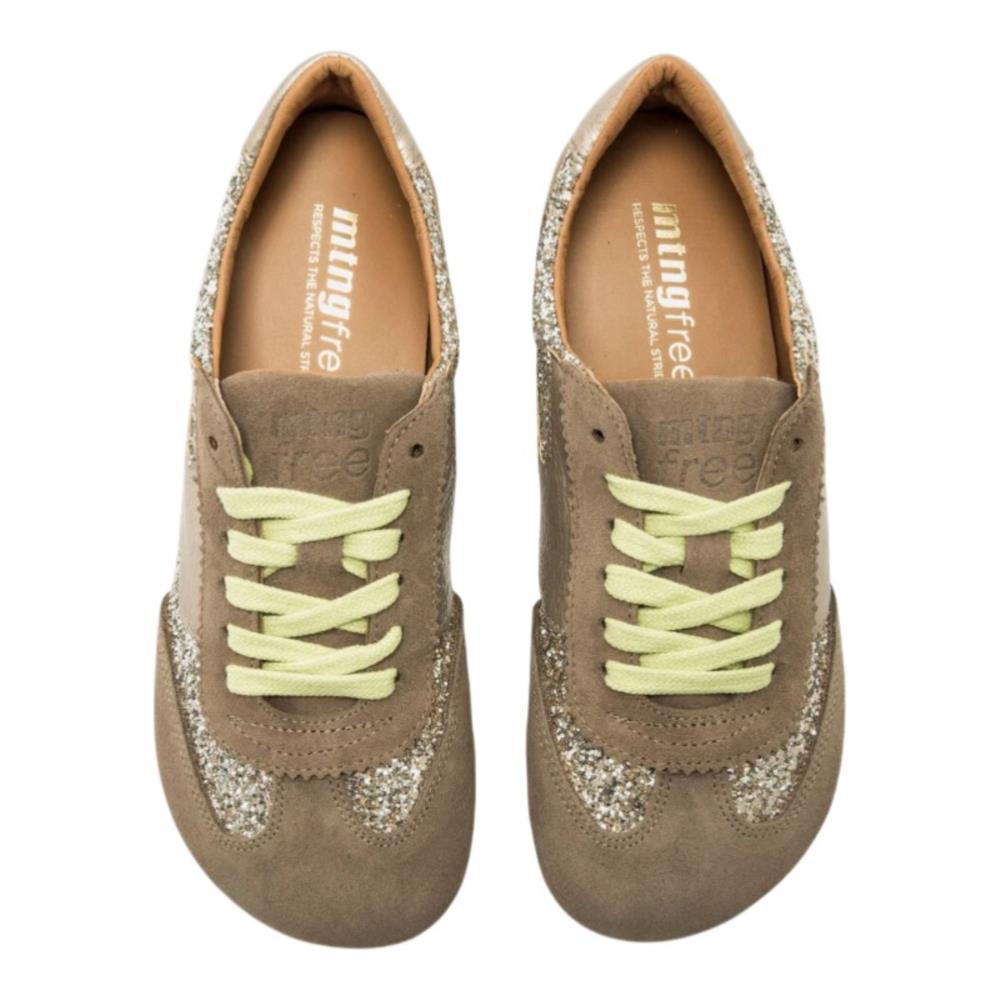 Las Mustang Free Mia combinan piel natural en color marrón con detalles metalizados y glitter plateado para un look original. Estas zapatillas barefoot para mujer están diseñadas como calzado respetuoso, con puntera ancha, suela plana cero drop y gran flexibilidad que favorecen la posición natural del pie.